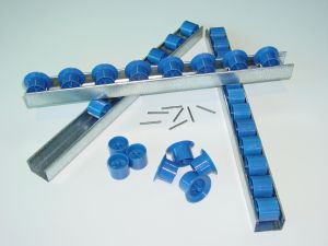 Cold-formed 35mm x 25mm x 0.8mm galvanized lipped channel sections assembled with moulded polyamid 28mm diameter plain or flanged wheels on steel axles at increments of 16.6mm pitch, give this mini wheel track infinite applications with load capacity up to 6Kg per wheel. Used extensively in carton flow live storage.