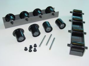 50mm Diameter plain or flanged moulded rollers fitted with either bearing or plain bushes, commercial or precision bearings and mounted on a 8mm diameter spindle in 70 x 70 x 2.5 lipped channel sections. Each roller has a capacity up to 50Kg which allows usage for pallet storage and handling.